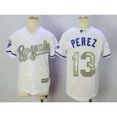 MLB Kansas City Royals 13 Salvador Perez White World Series Champions Gold Program Majestic Youth Jersey