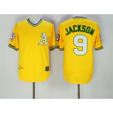MLB Mitchell And Ness Oakland Athletics 9 Reggie Jackson 1968 Majestic Cooperstown Yellow Throwback Men Jersey